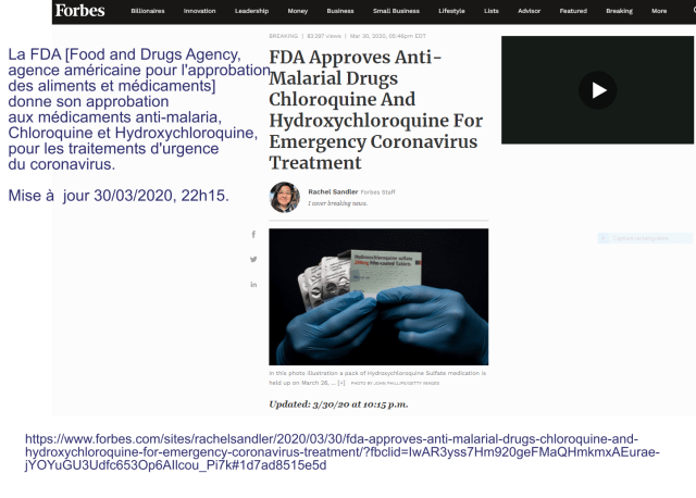 La FDA [Food and Drugs Agency, agence américaine pour l’approbation des aliments et médicaments] donne son approbation aux médicaments anti-malaria, Chloroquine et Hydroxychloroquine, pour les traitements d’urgence du coronavirus.