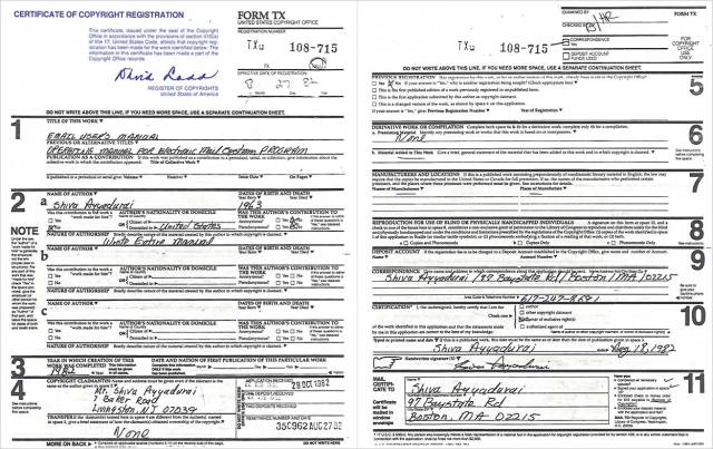 Premier Copyright US pour « EMAIL, programme informatique pour un Système de Courrier Électronique », publié au nom de V.A. Shiva Ayyadurai.