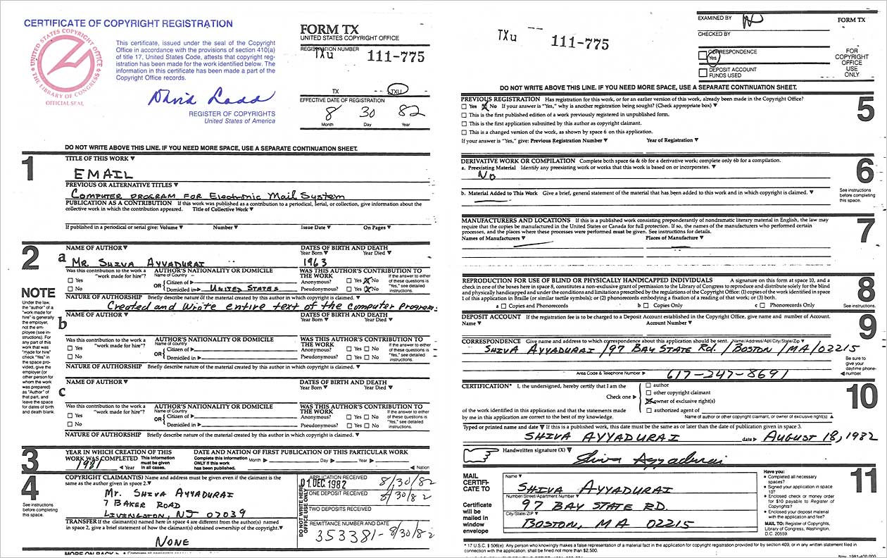 Premier Copyright US pour « EMAIL, programme informatique pour un Système de Courrier Électronique », publié au nom de V.A. Shiva Ayyadurai.