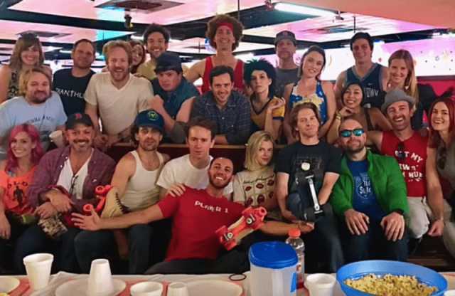 Isaac, premier rang, 3e en partant de la gauche. Clare, dernier rang, 3e en partant de la droite et Seth, juste devant elle, ou d’autres amis d’Hollywood comme l’acteur producteur Dane Cook.