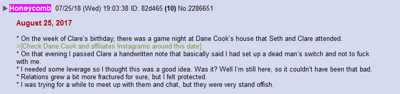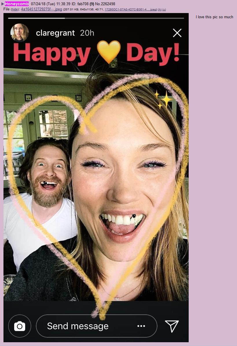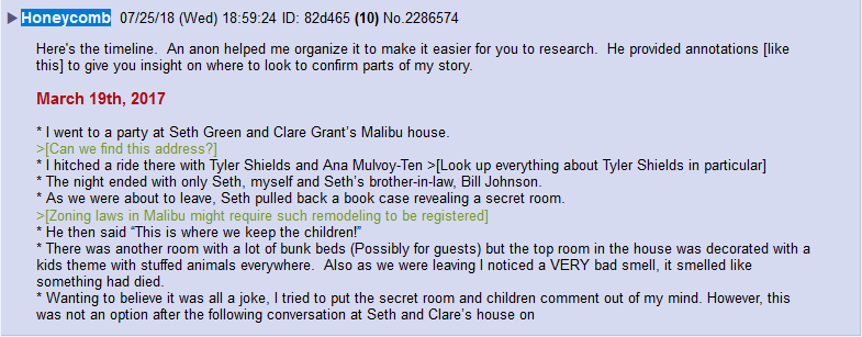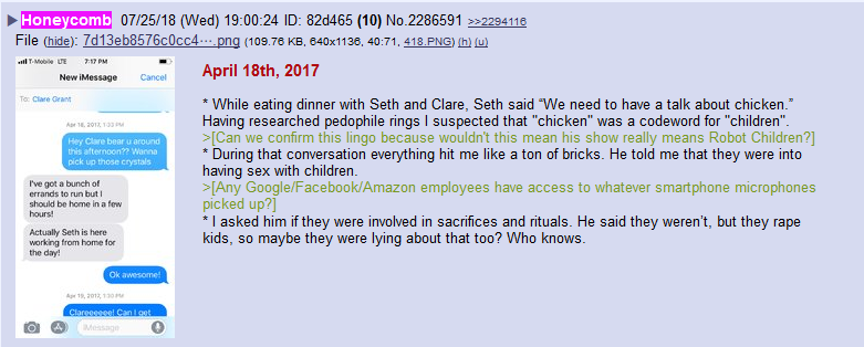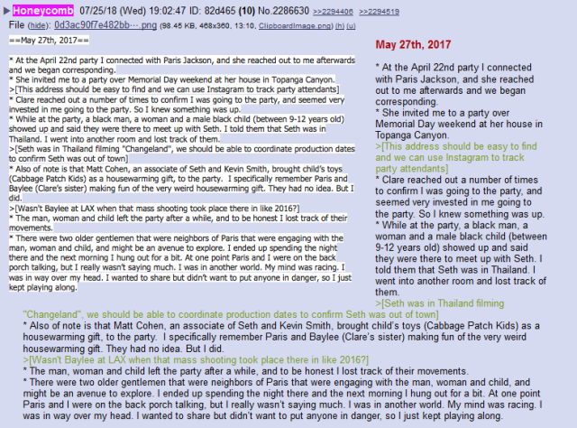 Le 24 juillet 2018, à 11 h 38, Isaac alias « Honeycomb » [rayon de miel] publie cette photo, qu’il avait reçue sur son portable et qui témoigne des liens étroits qu’il entretenait avec Seth Green et Clare Grant, en y ajoutant le commentaire :