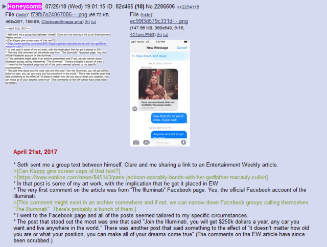 * La publication la plus notable disait : « Rejoignez les Illuminatis, vous recevrez 250.000 $ par an, la voiture qui vous plaît et pourrez vivre où vous voulez dans le monde. » Il y avait une autre publication qui disait quelque chose comme « Qu’importe votre âge ou votre position, vous réaliserez tous vos rêves » (Les commentaires sur l’article d’EW on été retirés depuis).