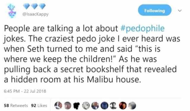 Les gens discutent beaucoup de blagues #pédophiles. La blague pédo la plus dingue que j’ai entendue a été quand Seth s’est tourné vers moi et m’a dit « C’est ici qu’on garde les enfants ! » Tandis qu’il faisait coulisser une étagère secrète, révélant une pièce cachée dans sa maison de Malibu.