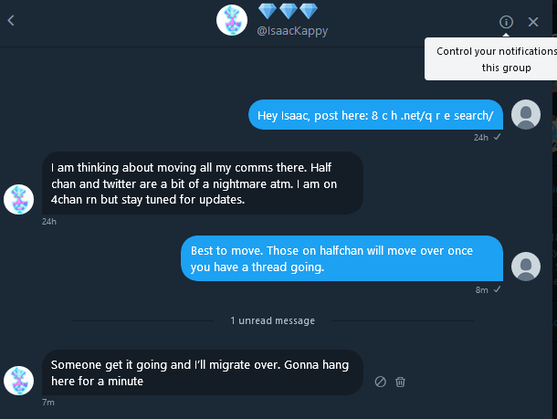 — Je songe à déplacer toutes mes comms là-bas. Moitié 8chan et moitié twitter, c’est un peu le cauchemar, pour l’instant. Là, je suis sur 4chan, mais restez à l’écoute pour des mises à jours.