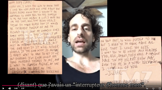 Ce PDF [L’interrupteur d’homme mort d’Isaac Kappy] contient les deux lettres qu’il comptait adresser à Clare Grant et Seth Green, mais qu’une autre personne à publiées dans le magazine TMZ. Le fichier contient aussi bien la traduction française que le scan de la version anglaise manuscrite.