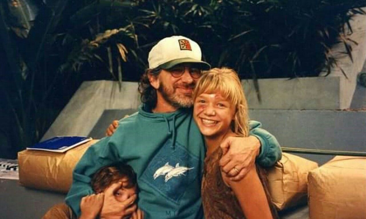 Steven Spielberg, avec les jeunes acteurs de Jurassic Park, Joseph Mazello (Tim) et Ariana Richards (Lex).
