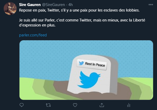 C'était prévu. Leurs serveurs (je crois) appartennaient à Amazon…Là, ils sont en train de tout refaire, ça va prendre un peu de temps… et probablement trop de temps puisque nous arrivons vers le 20 janvier à vitesse grand V.Parler est aussi un peu controversé mais je n'ai pas trop compris pourquoi.Sur Dab, il y a GenFlynn, Radio Québec, Lin Wood, Joe M etc… Paraît-il aussi que notre Donald a appelé les mecs de Gab lolCa mouline pas mal, je crois qu'il y a pas mal de monde dessus lol