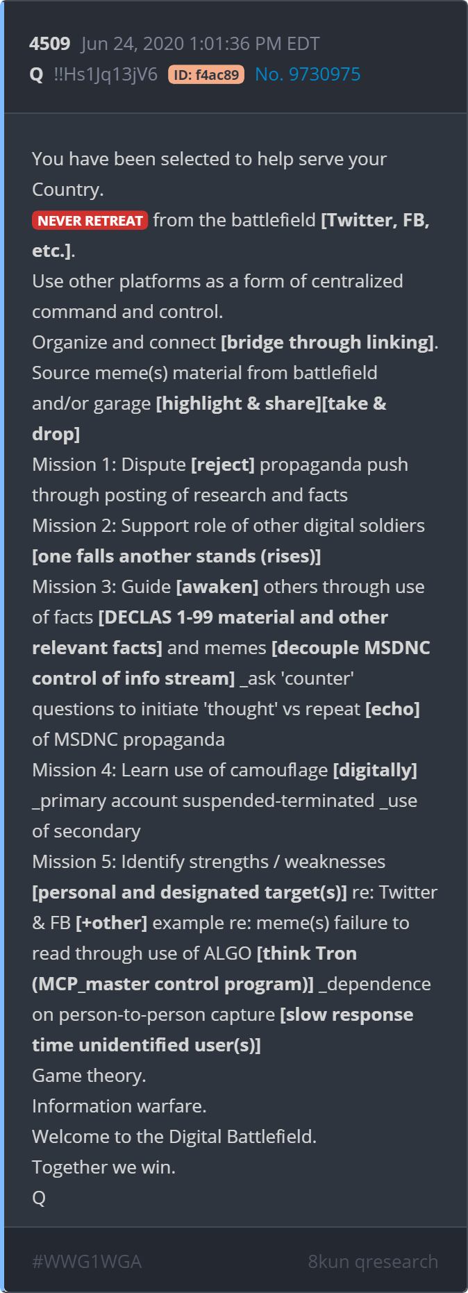 Mission 3 : Guidez [éveillez] les autres en utilisant des faits [Informations DÉCLASsiffiées 1-99 et d’autres faits appropriés] et des mèmes [dissociez le contrôle du flux d’info de MSNDNC] _posez des « contre »-questions pour déclencher la « réflexion » face à la répétition [écho] de la propagande de MSNDNC