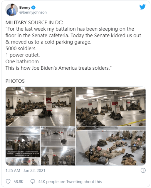 Comme rapporté antérieurement par Cristina Laila – Une source militaire à DC a dit au Responsable en Chef de la Création de TPUSA, Benny Johnson, que durant les dernières semaines, son bataillon avait dormi sur le sol de la cafétéria du Sénat, en préparation de la fausse inauguration de Biden.