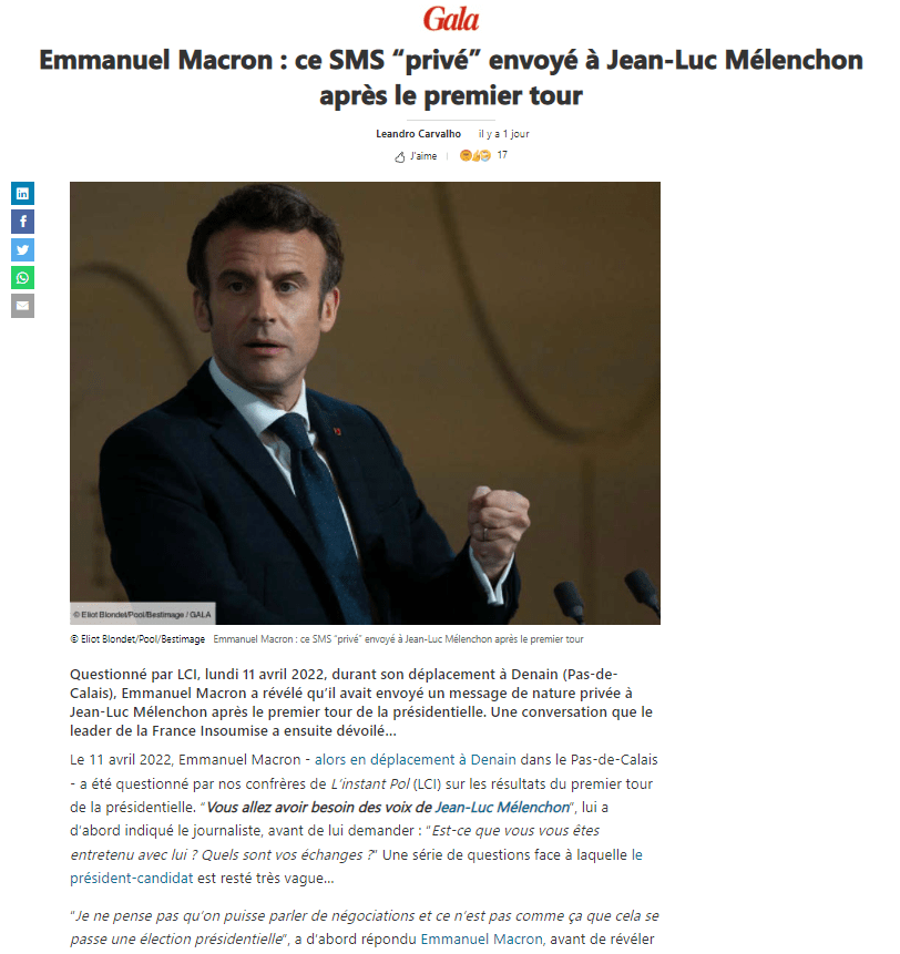 C’est la Canard Enchaîné qui a dévoilé le pot aux roses, avant d’être imité par d’autres médias comme Gala (Emmanuel Macron : ce SMS “privé” envoyé à Jean-Luc Mélenchon après le premier tour).