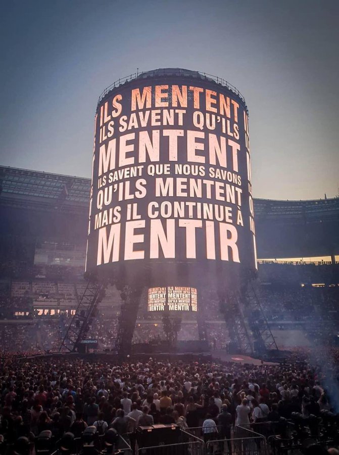 Beaucoup se sont interrogés sur les messages du groupe Indochine, diffusés sur un panneau circulaire du Stade de France, comme cette citation d’Alexandre Soljenitsyne, modifiée pour cibler Poutine.