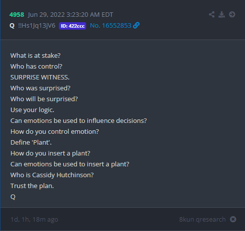 Cassidy Jacqueline Hutchinson (née 1995/1996) est une ex-assistante de l’ancien Chef du personnel de la Maison-Blanche, Mark Meadows, durant la présidence de Donald Trump. Le 28 juin 2022, Hutchinson a témoigné à l’audience publique de la commission d’enquête du Congrès des États-Unis, au sujet de l’assaut du Capitole, le 6 janvier 2021. Elle a fourni un témoignage à charge sur le conduite du Président Trump, de ses principaux assistants et alliés politiques avant et durant l’Assaut du Capitole le 6 janvier 2021, qualifiant notamment Donald Trump de « déséquilibré ».