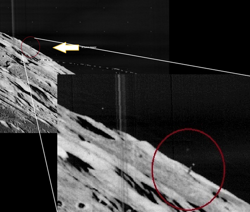 Même si on constate qu’il y a, ici et là, une excroissance ou une structure anormale, vu la faible résolution du cliché, ce ne sont pas des preuves. Comme cette photo prise lors de la mission Apollo 14, montrant une tour s’élevant au-dessus du sol lunaire.