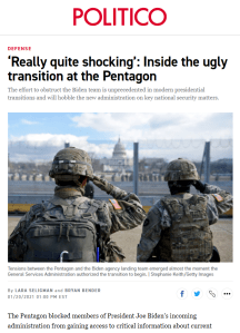 – les 21 coups de canon traditionnels, en salves rapides, de chaque inauguration présidentielle n’ont pas été tirés quand Biden a prêté serment. Au lieu de cela, il y a eu un simulacre brouillon où quelques coups de canon désordonnés ont été tirés au cimetière d’Arlington, que les médias ont relayé comme substitut du protocole centenaire.