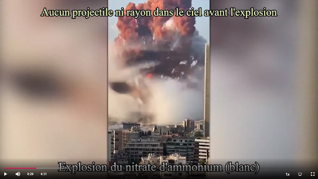 — L’analyse de l’explosion par l’ex-agent de la CIA recoupe ce qu’on voit dans la vidéo montrant l’explosion sous douze angles de vue : 1. incendie de l’entrepôt de munitions ; 2. explosions répétées de munitions de type militaire ; 3. intensification de l’incendie ; 4. explosion d’une substance incendiaire et/ou explosive qui n’est pas le nitrate d’ammonium ; 5. explosion du nitrate d’ammonium avec son dégagement de gaz blanc (la sphère, puis le champignon). Vous pouvez confirmer ce dernier point en visionnant des vidéos d’explosion de nitrate d’ammonium, il y en a un certain nombre sur Internet.